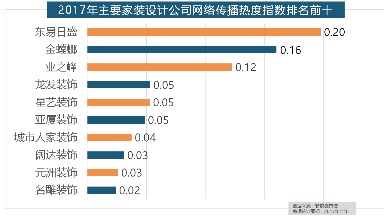 据新浪微舆情对2017年我国次要家拆设想公司大数据阐发显示,正在收集热度指数排名前十的品牌中,近年来,金螳螂、业之峰、龙发粉饰、星艺粉饰紧随其后?